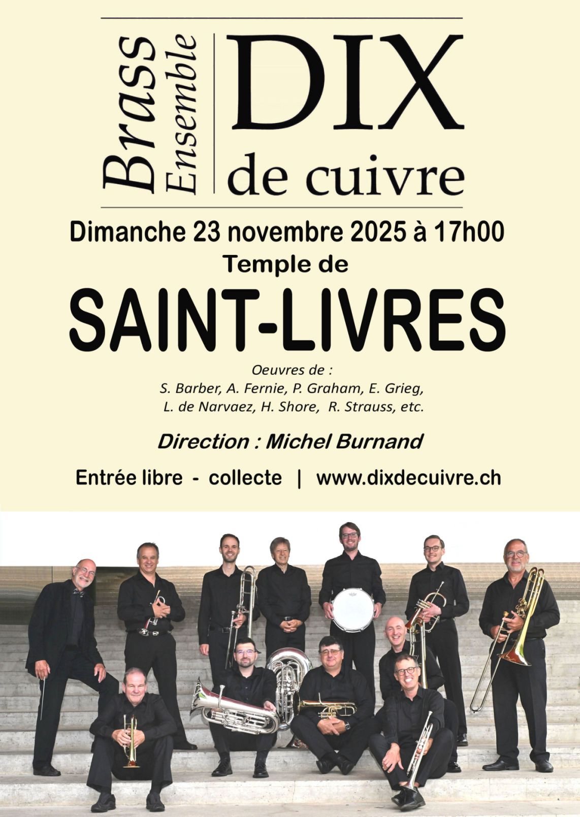 Une heure musicale au cours de laquelle les dix cuivres et le percussionniste interpréteront un programme éclectique, allant de la Renaissance aux standards du Jazz. Avec des pièces créées ou spécialement arrangées pour ce type de formation dont les thèmes de la musique du film The Lord of the Rings (Le Seigneur des Anneaux) composé par Howard Shore, le magnifique Adagio de Barber, Honey Pie des Beatles et même une Attack of the killer Trombones !! de Fernie