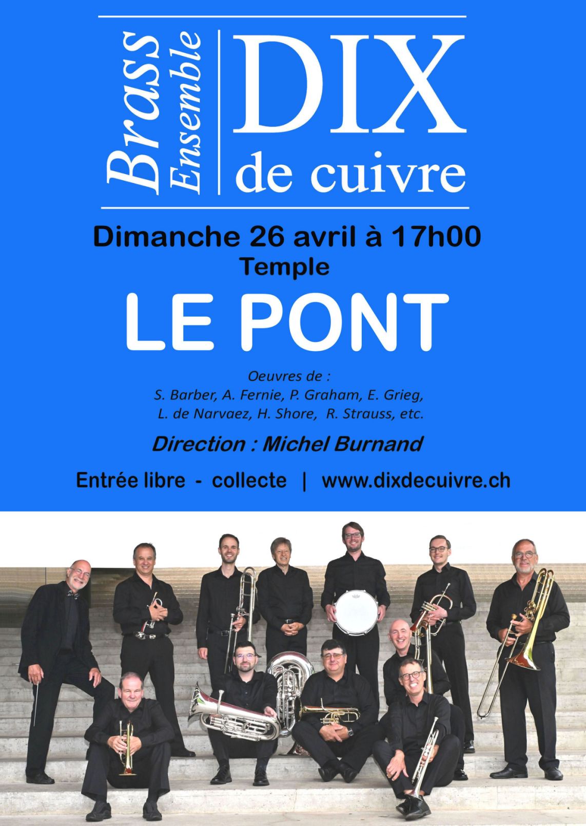 Le dimanche 19 avril, retrouvez les représentants de notre ensemble : Michel Burnand, notre directeur ; Olivier Baud, notre cornet mi b ; Olivier Baudraz, notre tuba
