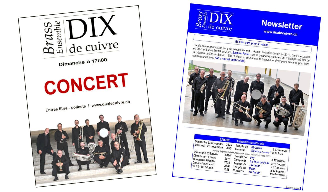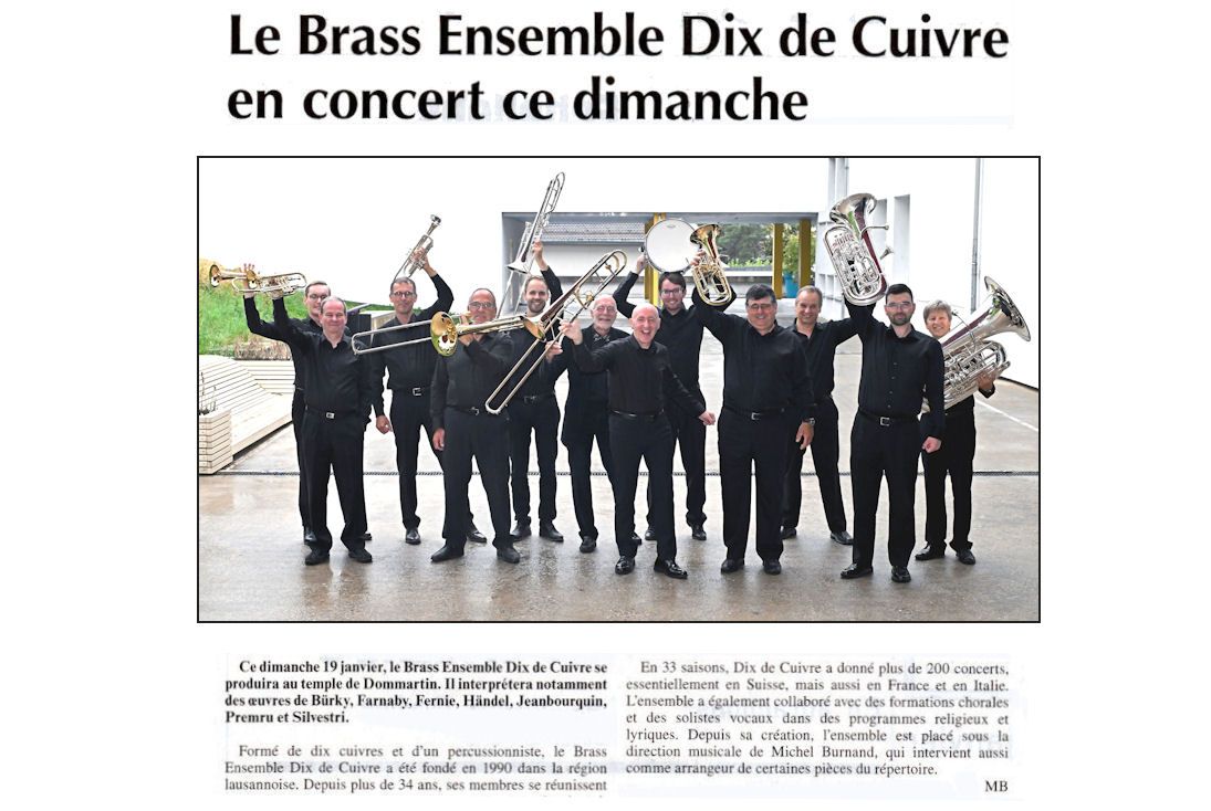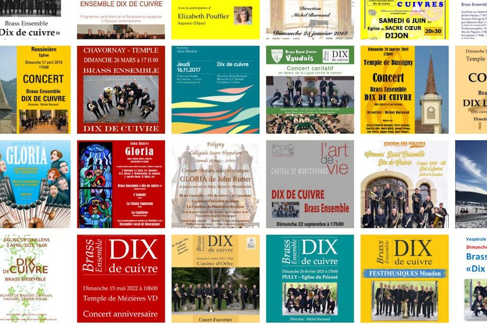 En 34 saisons, DIX DE CUIVRE a donné plus de 215 concerts, essentiellement en Suisse, mais aussi en France (Normandie, Grand Est, Bourgogne-Franche-Comté) et en Italie (Lombardie, Sicile). L’ensemble a également collaboré avec des formations chorales et des solistes vocaux dans des programmes religieux et lyriques.