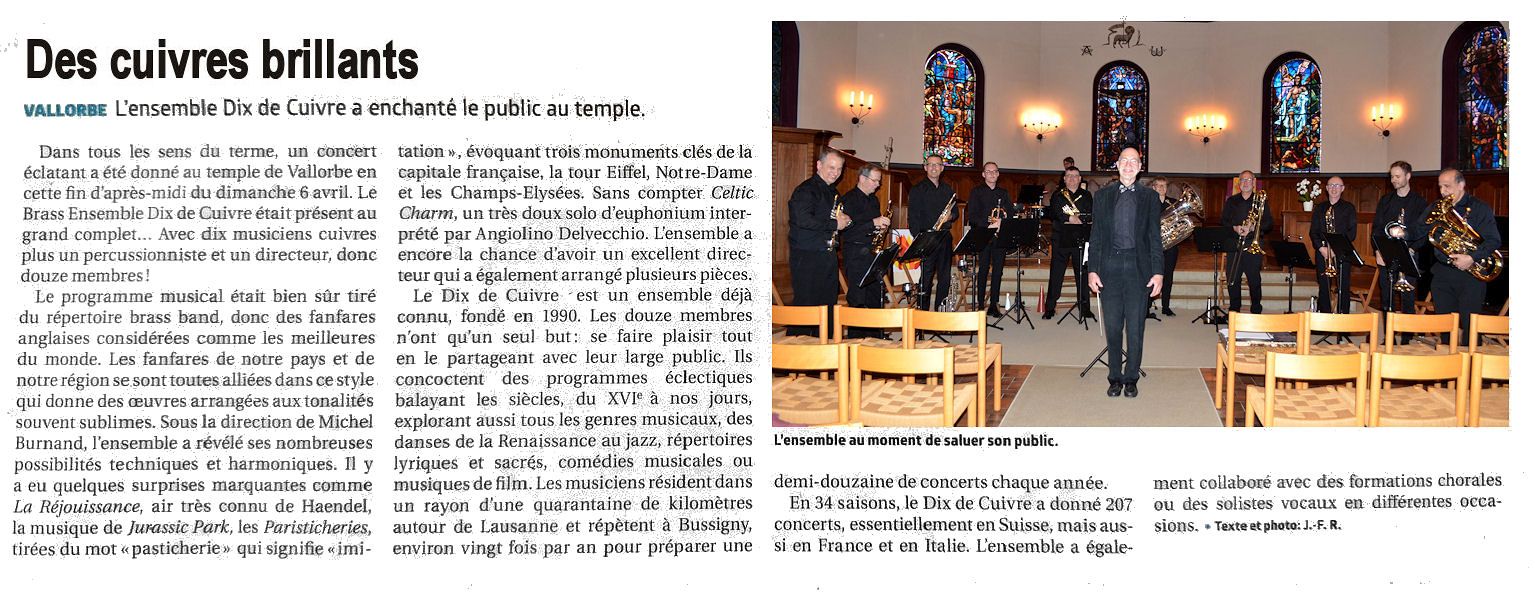 Article de presse du concert de Dix de cuivre à Vallorbe le 6 avril 2025
