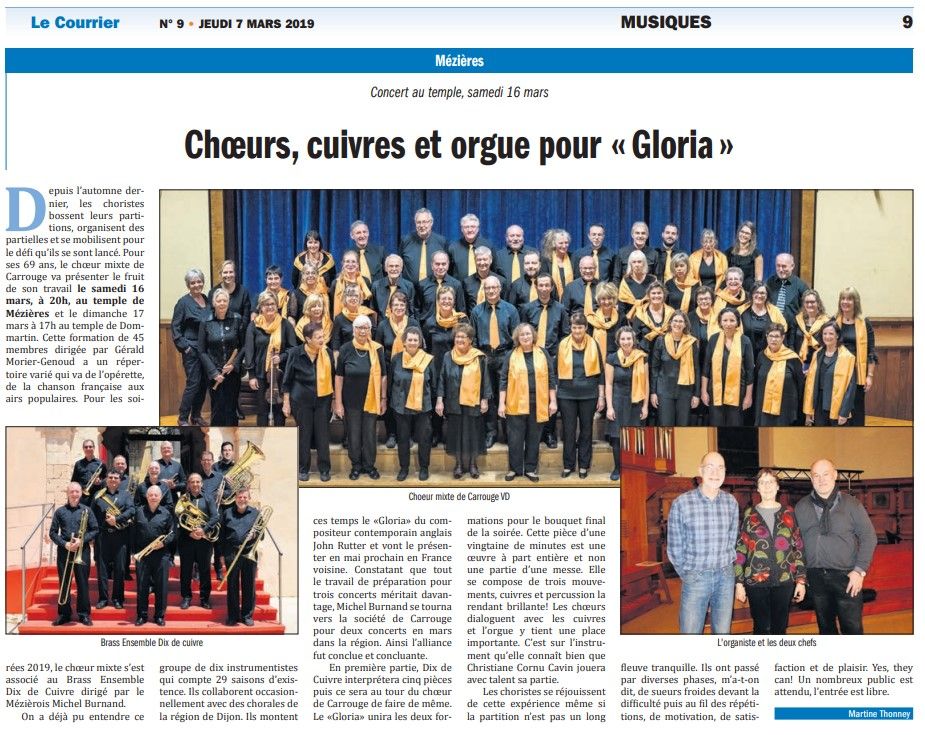 Article paru dans Le Courrier d'Oron à propos du concert de Dix de cuivre du "Gloria" de Rutter pour choeur, cuivres et orgue avec la participation du Choeur mixte de Carrouge (VD) et de l'organiste Christiane Cornu Cavin.