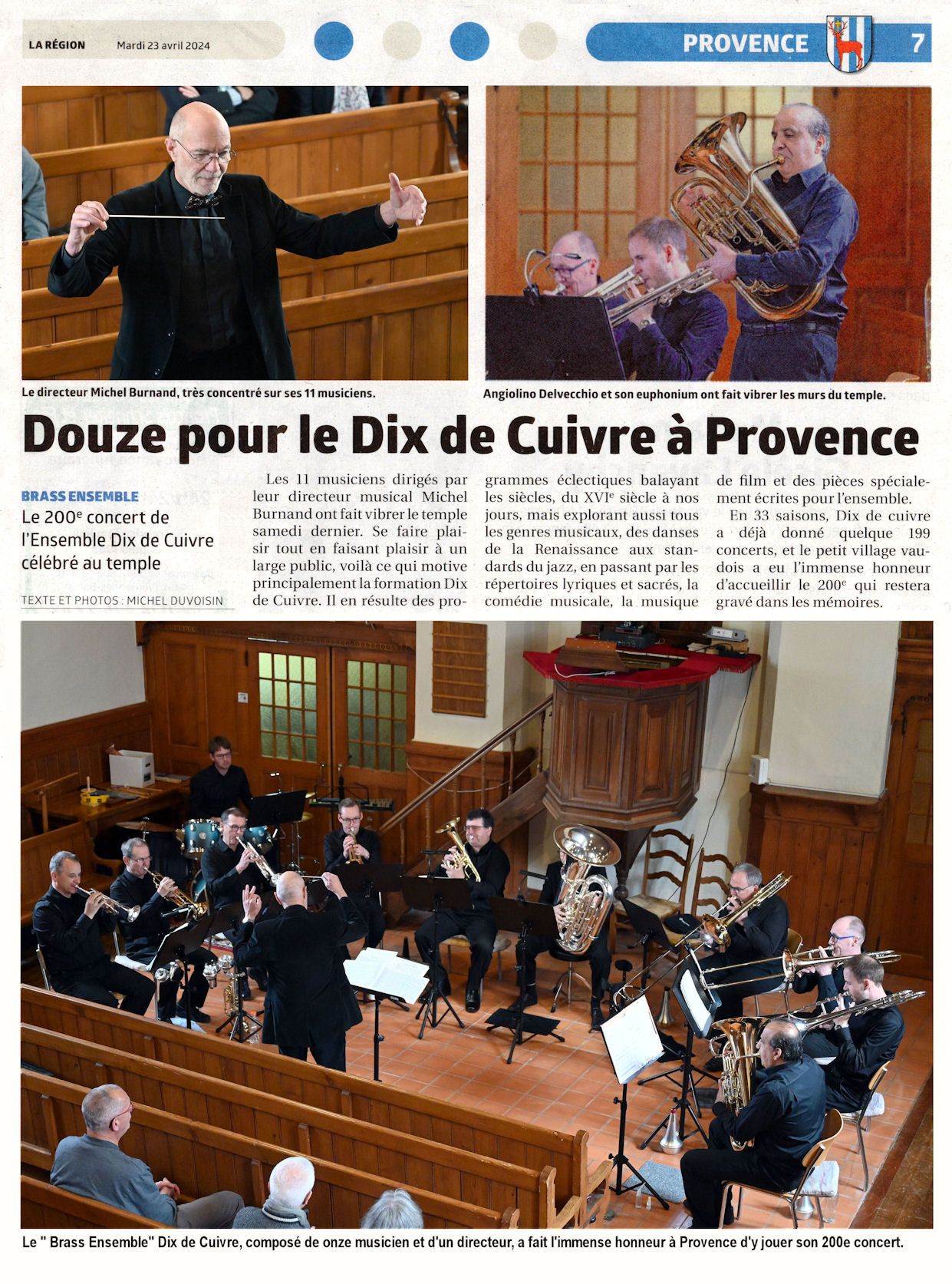 Article de presse sur le 200e concert de Dix de cuivre à Provence le 23 avril 2024