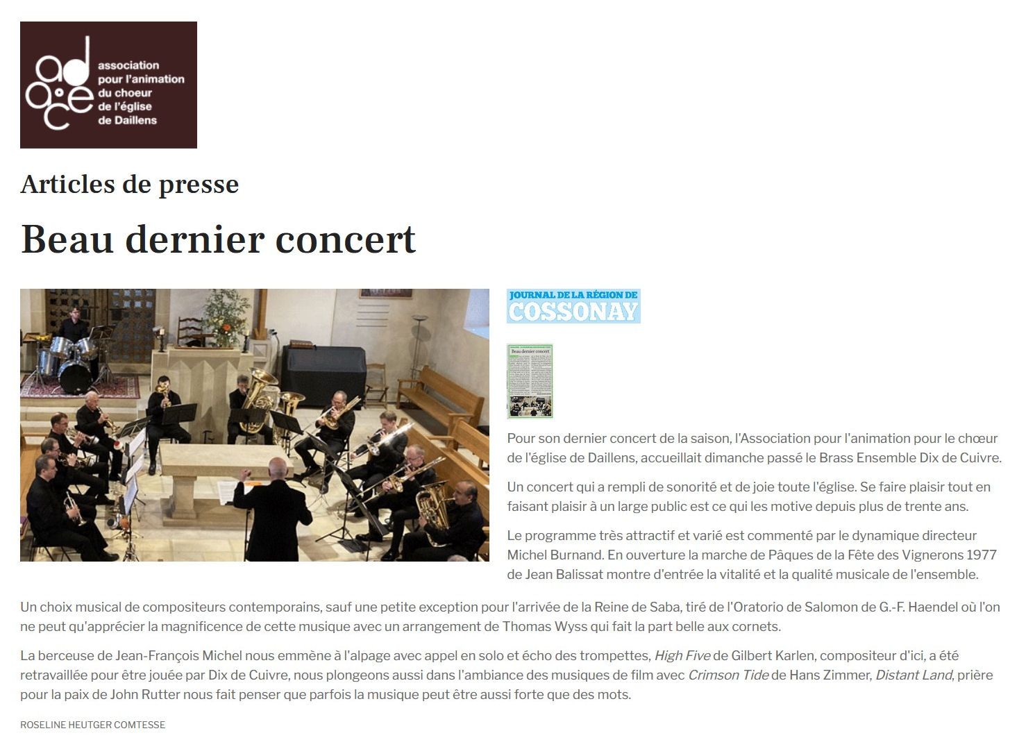 Article paru dans le Journal de la Région de Cossonay à propos du concert de Dix de cuivre organisé par l'Association pour l'animation du chœur de l'église de Daillens